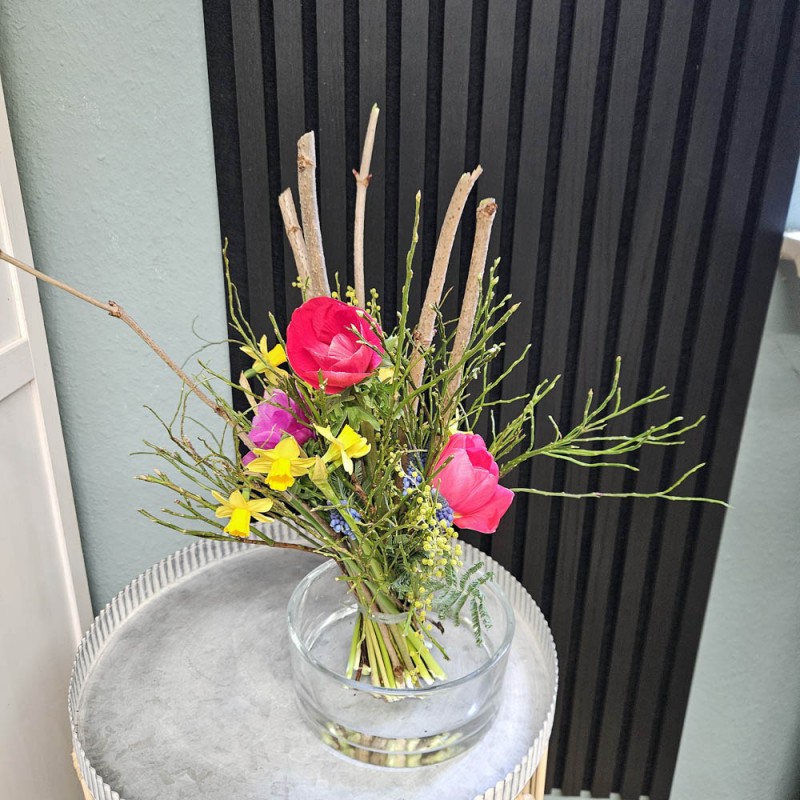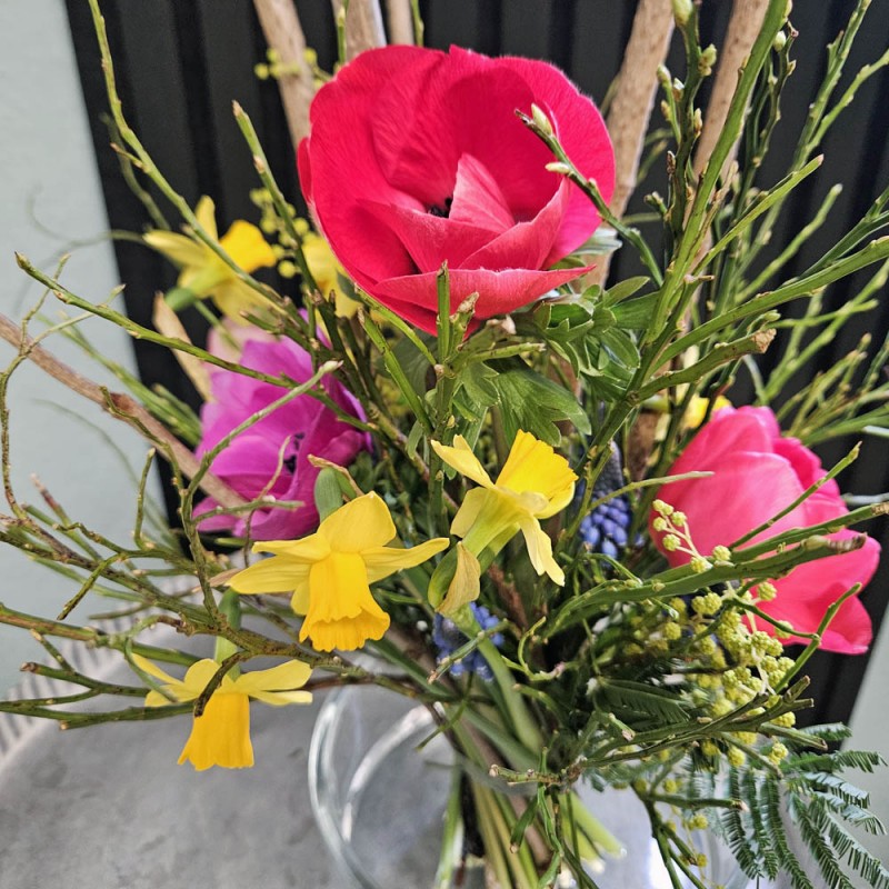 Bunte Frühlingsblüher wie z.B. Tulpen, Anemonen Narzissen, Muscari werden mit Zweigen puristisch in Szene gesetzt.