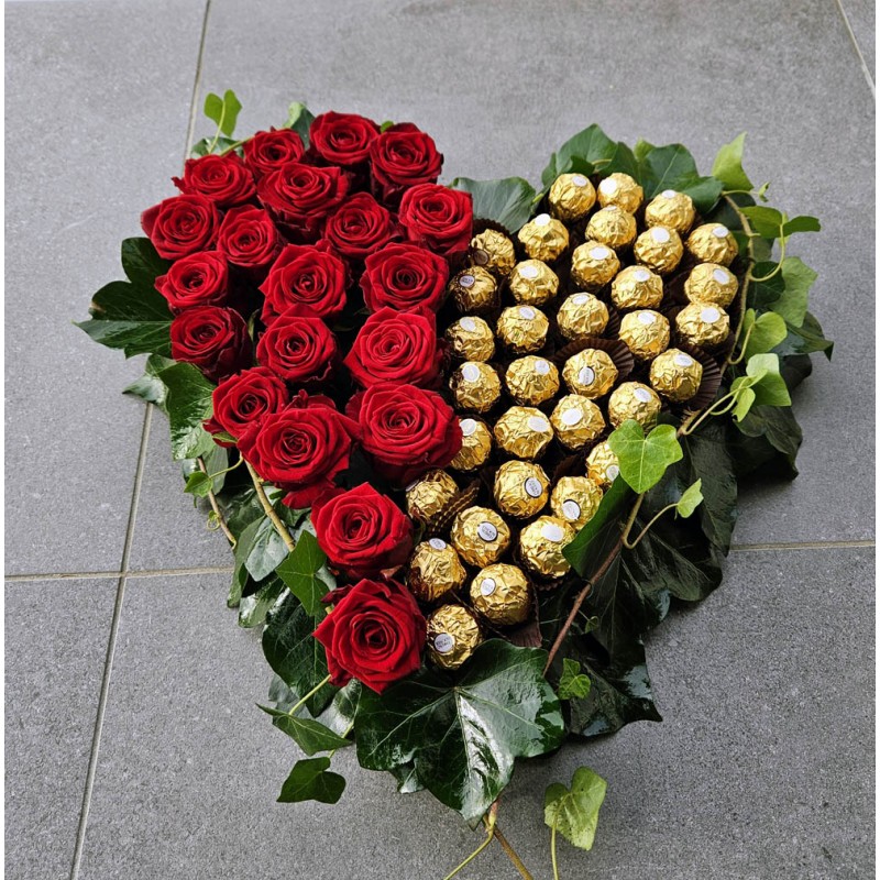 In eine herzförmige Unterlage werden die Rosenblüten mit den Schokoladen Kugeln arrangiert.