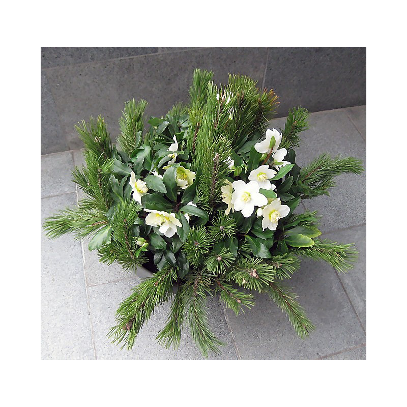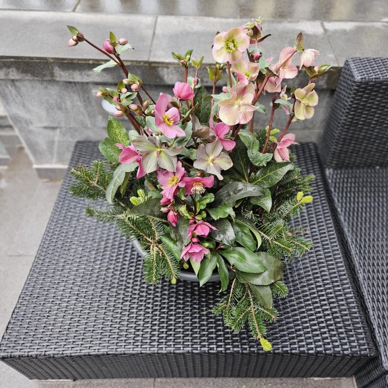 Edle Christrosen werden mit winterlichem Beiwerk zu einer dekorativen Schale gepflanzt.