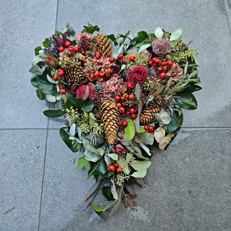 In eine herzförmige Unterlage werden lang haltbare Blumen, getrocknete Blüten, Fruchtstände und Grünmaterialien arrangiert.